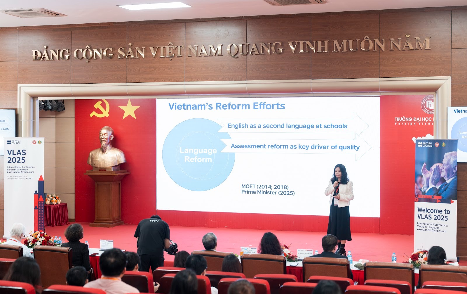 Ngày 8 tháng 11 năm 2025, các giảng viên của Khoa Tiếng Anh, Trường Đại học Sư phạm Hà Nội (HNUE) đã tham dự hội thảo quốc tế Vietnam Language Assessment Symposium (VLAS) 2025 – English Language Assessment in the New Age (Đánh giá năng lực tiếng Anh trong kỷ nguyên mới), do Trường Đại học Ngoại thương phối hợp cùng Hội đồng Anh (British Council) và Đề án Ngoại ngữ Quốc gia (NFLP) đồng tổ chức. Hội thảo nằm trong chuỗi sự kiện New Directions của Hội đồng Anh, hướng tới thúc đẩy đối thoại chuyên môn trong lĩnh vực giảng dạy, học tập và đánh giá năng lực tiếng Anh tại khu vực châu Á.